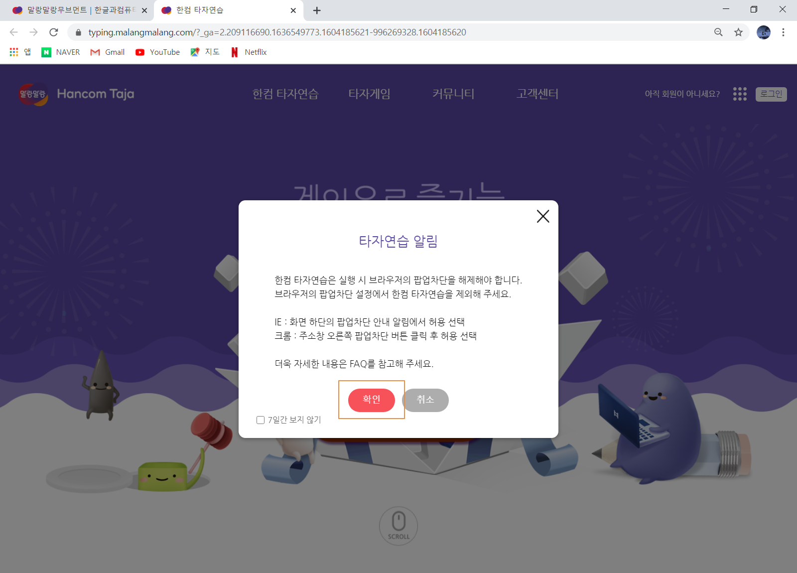 한컴 타자연습은 실행 시 웹 브라우저의 팝업차단을 해제해야 합니다. 브라우저의 팝업 차단 설정에서 한컴 타자연습을 제외하시면 됩니다. <확인>을 누릅니다.