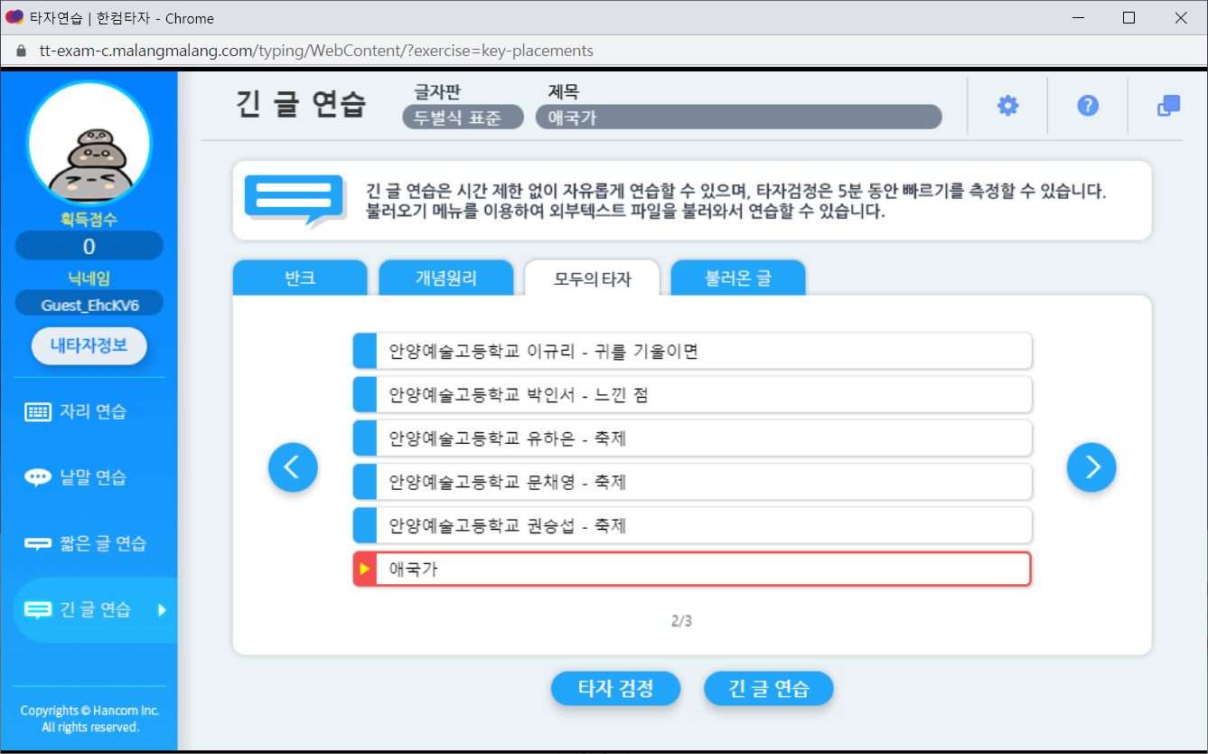네 번째 메뉴는 긴 글 연습입니다. 예전에 많이 연습하였던 애국가가 있습니다. 아직도 애국가가 기본적인 연습용으로 사용되는 것 같습니다.