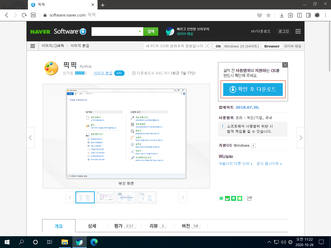 <확인 후 다운로드>를 누릅니다. 프리웨어로 기업 및 단체 또는 개인을 포함한 모든 사용자에게 무료입니다. 외국 사이트에서는 픽픽 프로그램이 유료로 표시되는곳도 있지만 한국어 사용자에게는 무료입니다.
