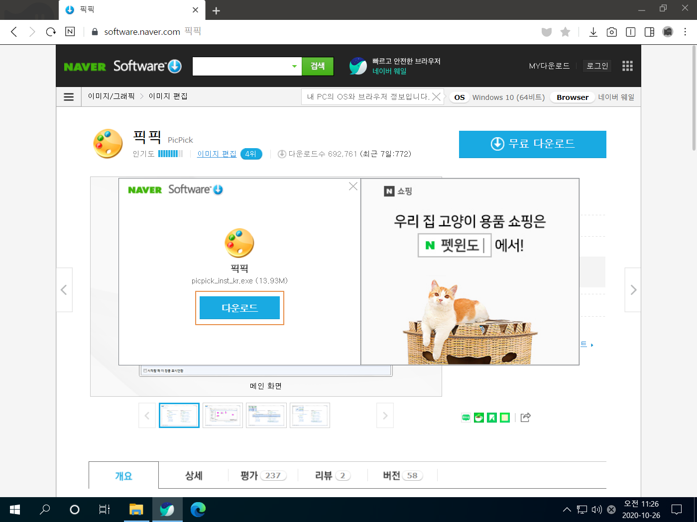 <무료 다운로드>를 누릅니다. 네이버 소프트웨어 자료실의 픽픽 페이지로 이동합니다. 만약 픽픽 홈페이지로 접속하신다면 더 최신 업데이트 버전을 다운로드하실 수 있을 것 같습니다만 버전 업데이트는 설치한 이후에도 꾸준히 진행되므로 구 버전을 설치하시고 나중에 업데이트하셔도 만찬 가지이긴 합니다.