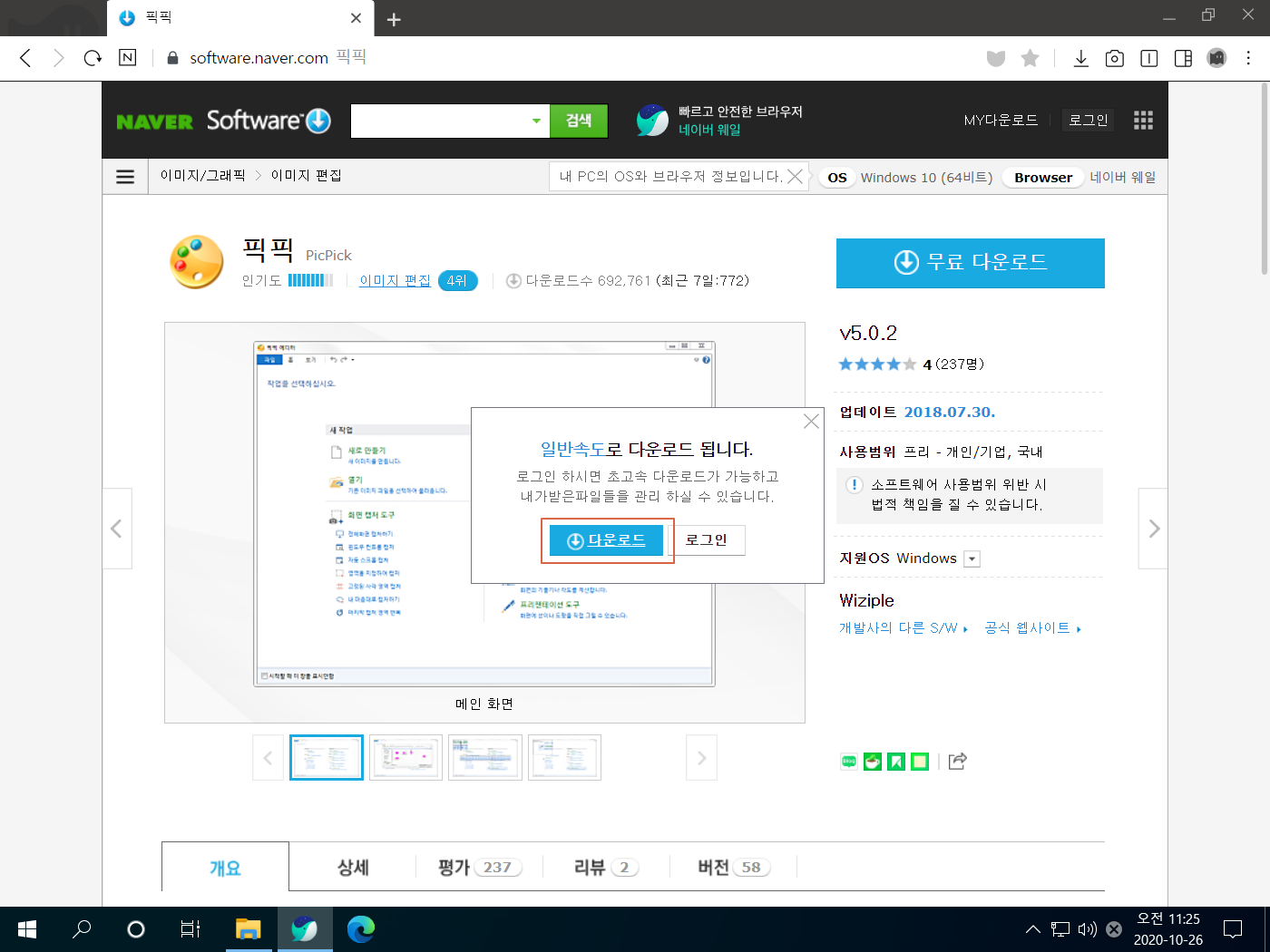 <다운로드>를 누릅니다. 네이버에 로그인하시면 고속 다운로드가 된다고 하나 큰 차이는 없습니다.