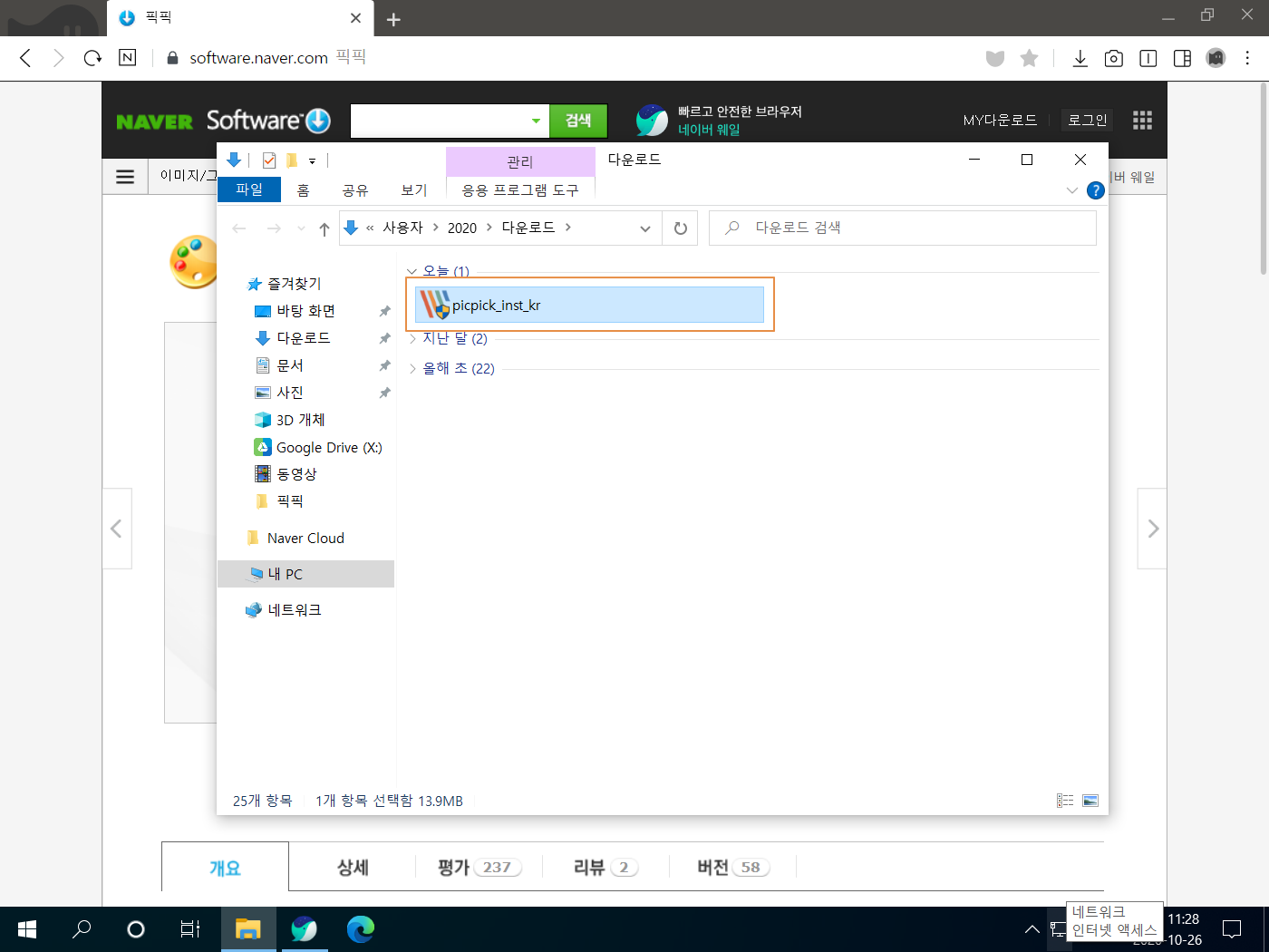 다운로드가 완료되면 윈도우 탐색기에서 내려받은 경로로 이동합니다. 픽픽 설치 파일을 실행합니다.